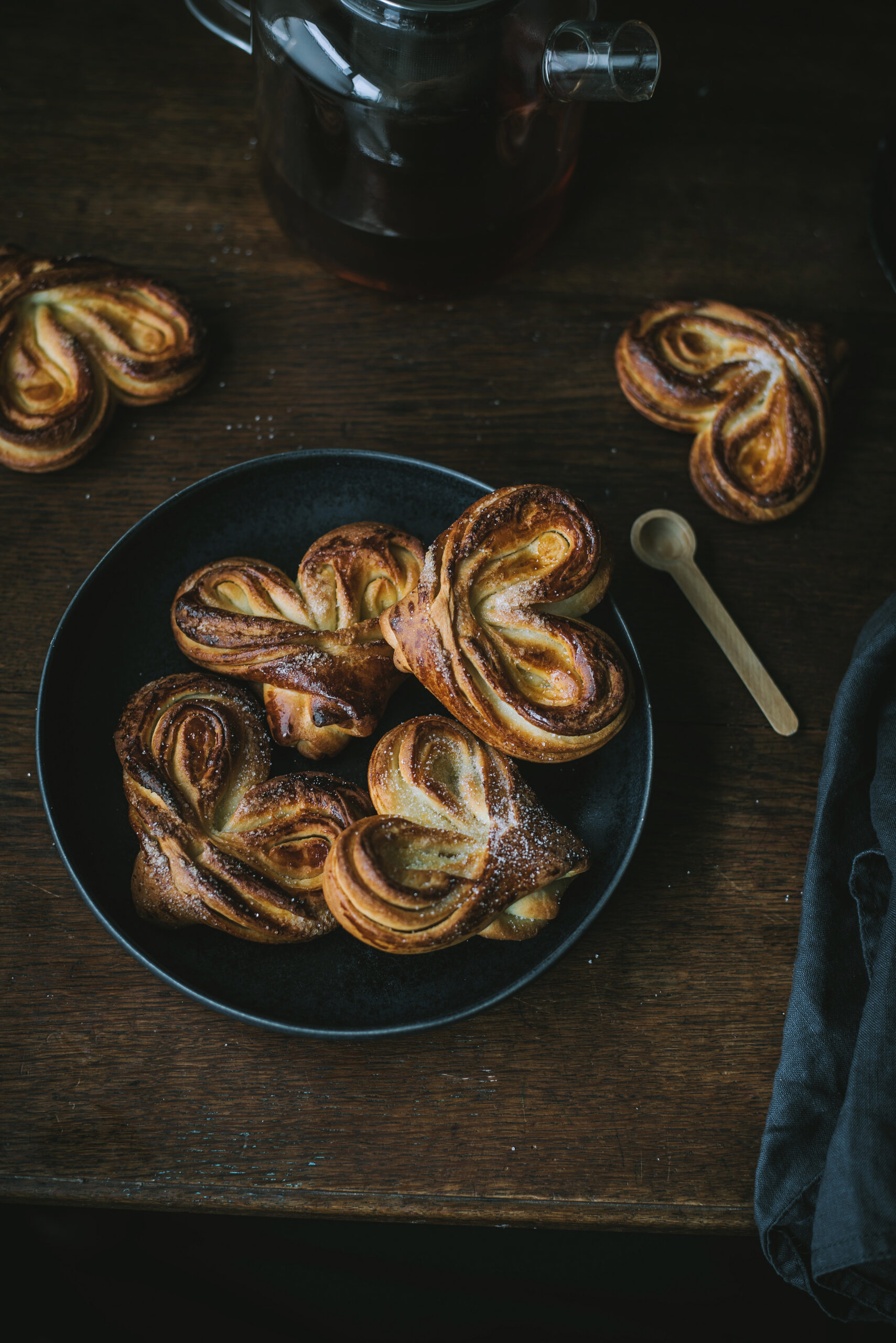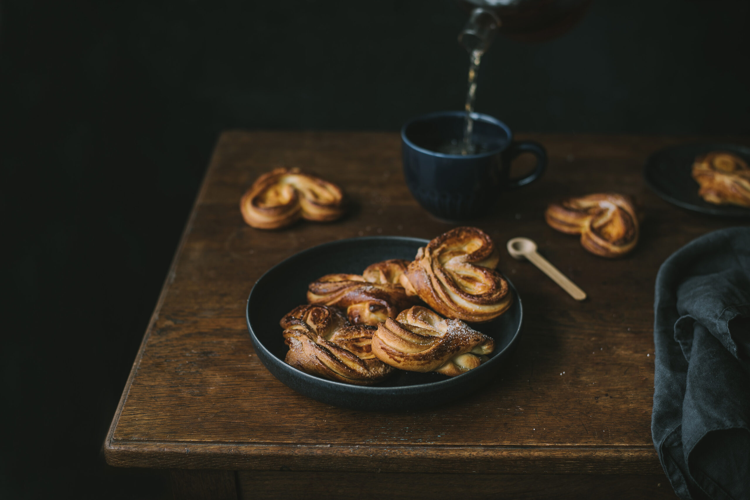 8. Kiekvieną rutuliuką iškočiok į stačiakampį. Aptepk plonu sviesto sluoksniu ir pabarstyk cukrumi bei vaniliniu cukrumi.